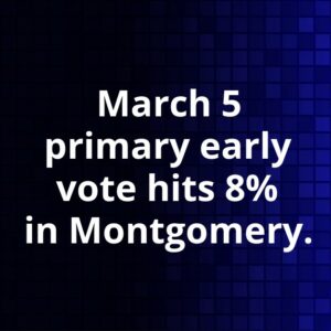 As of the evening of February 26, midway through the early voting period, just over 8% of registered voters in Montgomery County had cast their ballots. A total of 39,235 votes were recorded, out of the county’s 481,228 registered voters. This figure reflects the period from early voting’s start on February 19 through February 26.